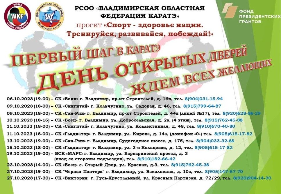 во Владимире и Владимирской области пройдут Дни открытых дверей в клубах Владимирской областной федерации каратэ.